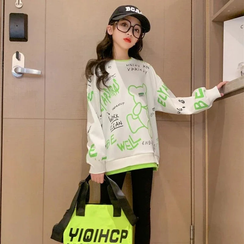 クマプリント長袖スウェット ゆったりカジュアルトップス