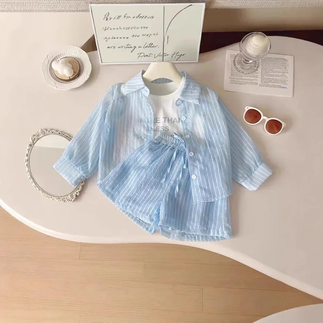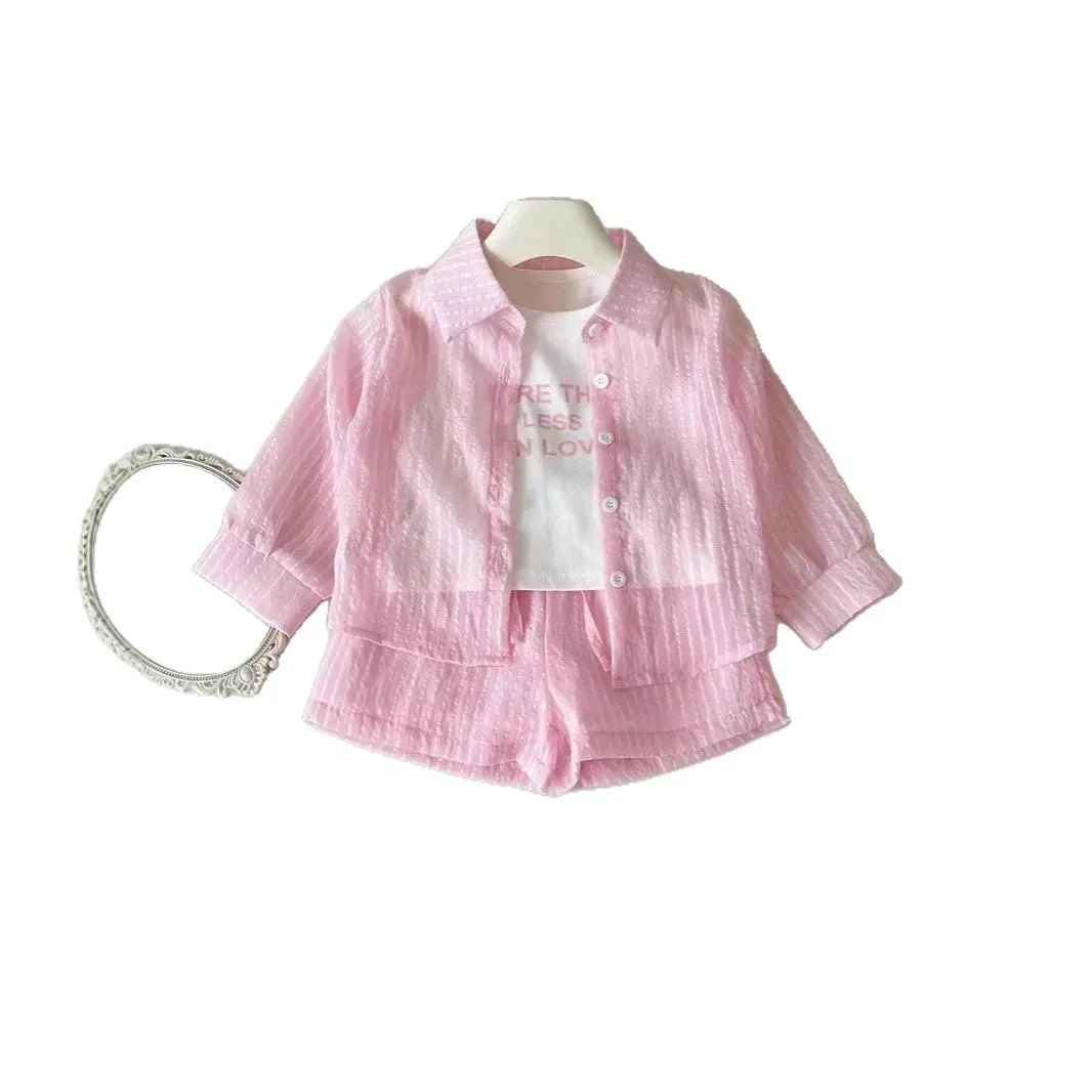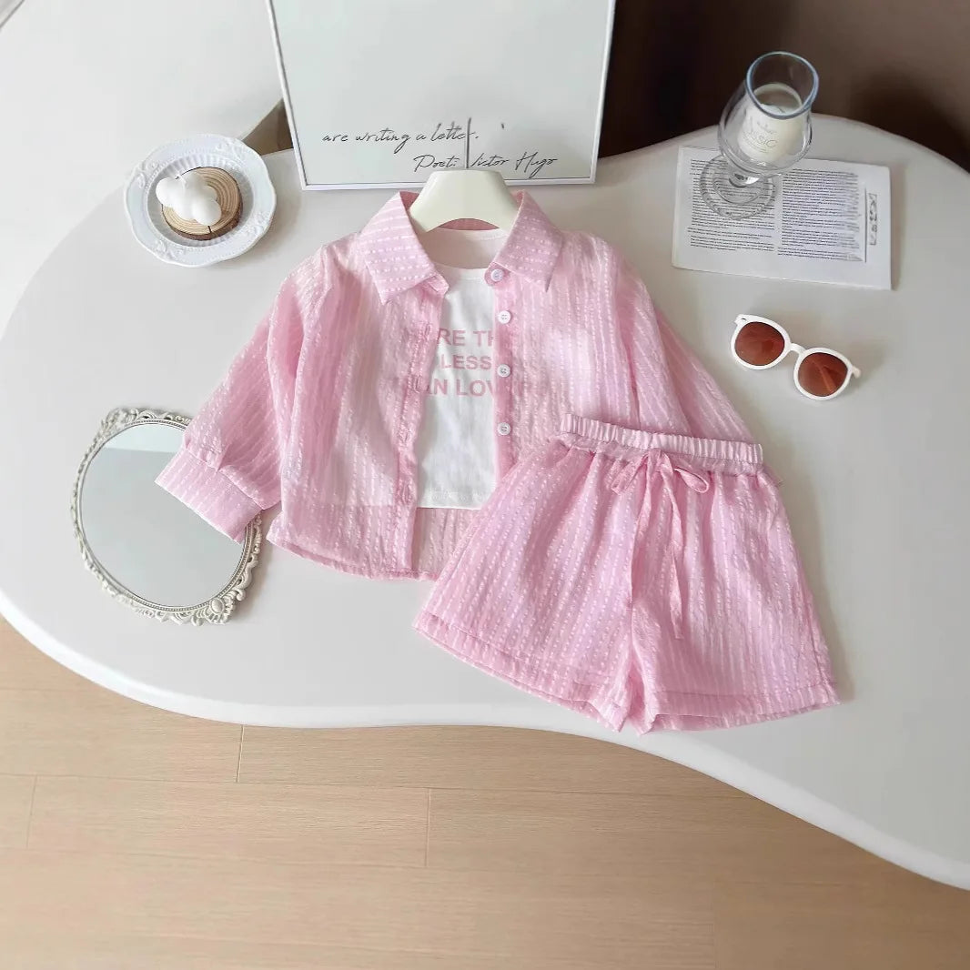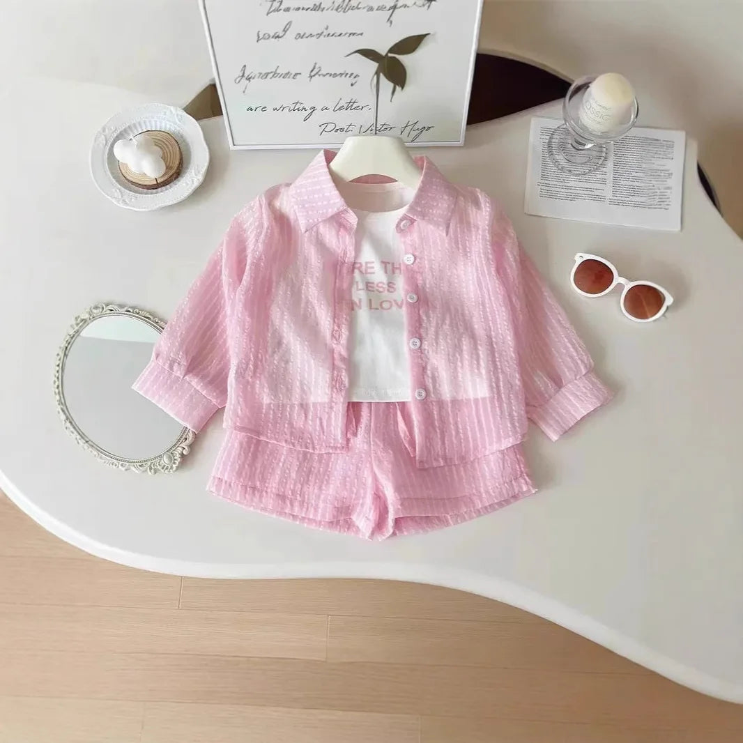 シアサッカー素材のピンクシャツとショートパンツに、キュートなメッセージTシャツを組み合わせた、トレンド感たっぷりのコーディネート。