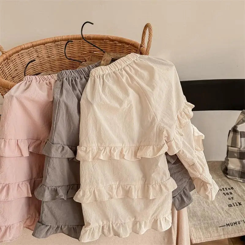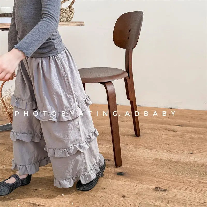 やさしい肌触りの綿100%素材で作られた、3段フリルがキュートなワイドパンツ。