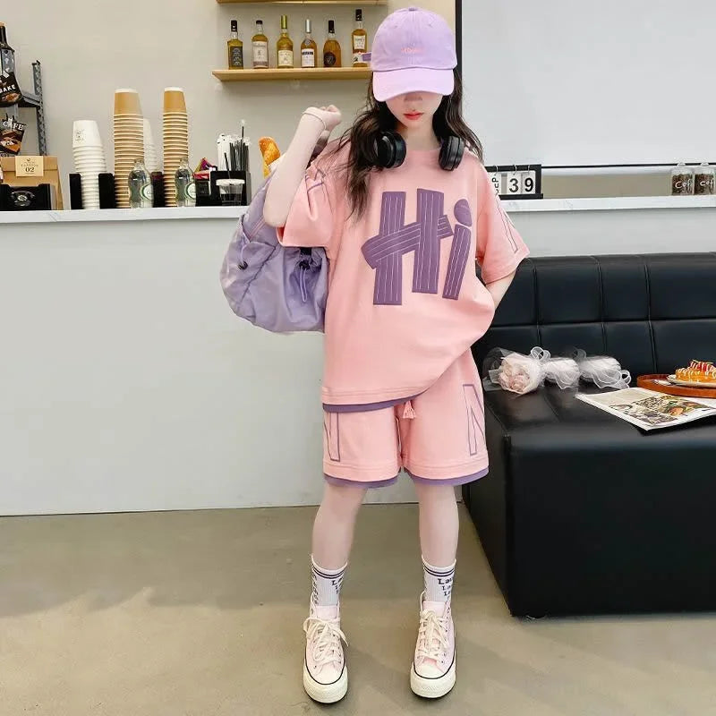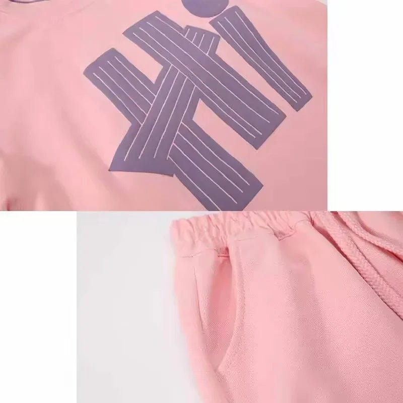 トレンド感たっぷりのバイカラーデザインが可愛い半袖セットアップ。パープル×ピンクの2色展開で、大きなHiロゴがポイント。