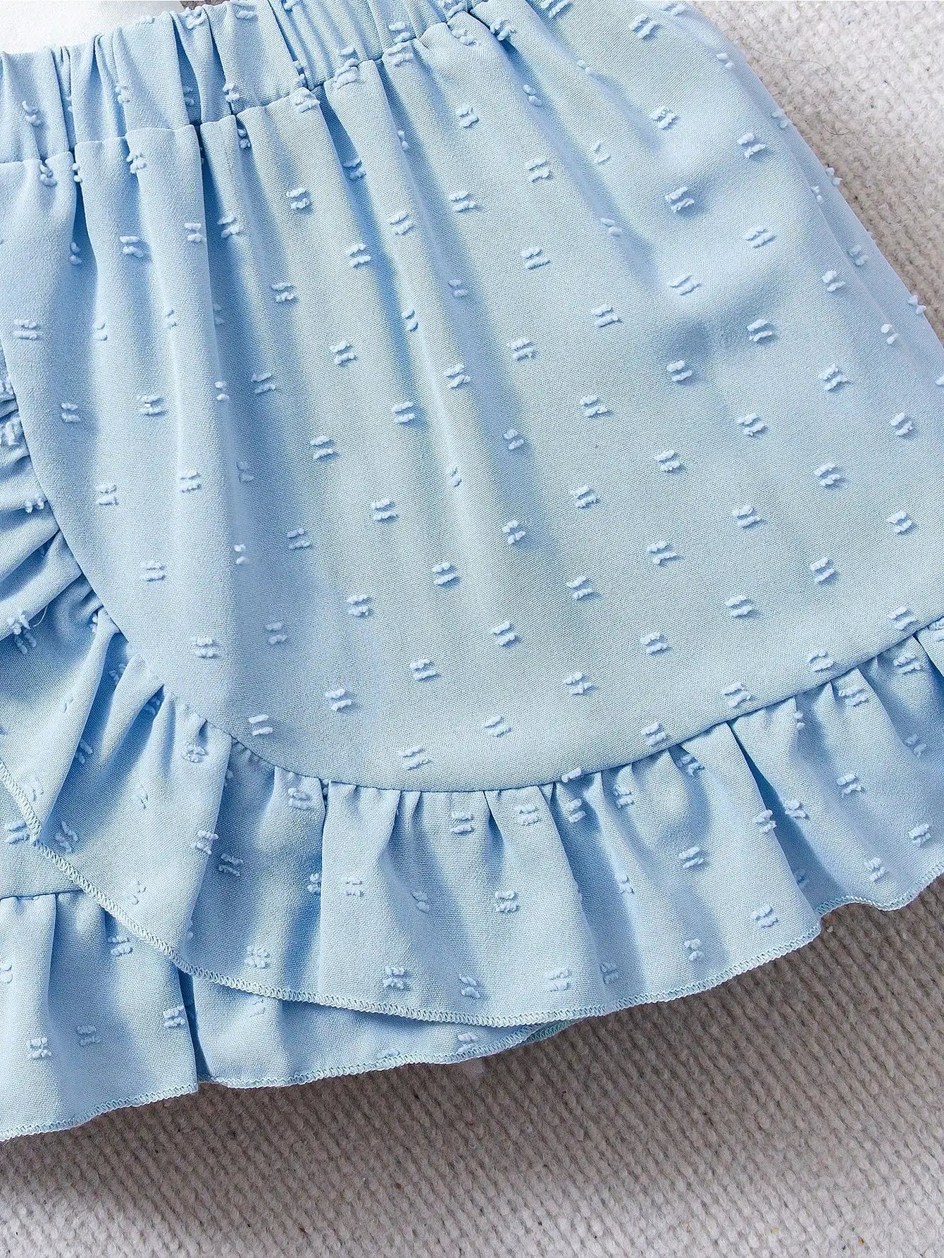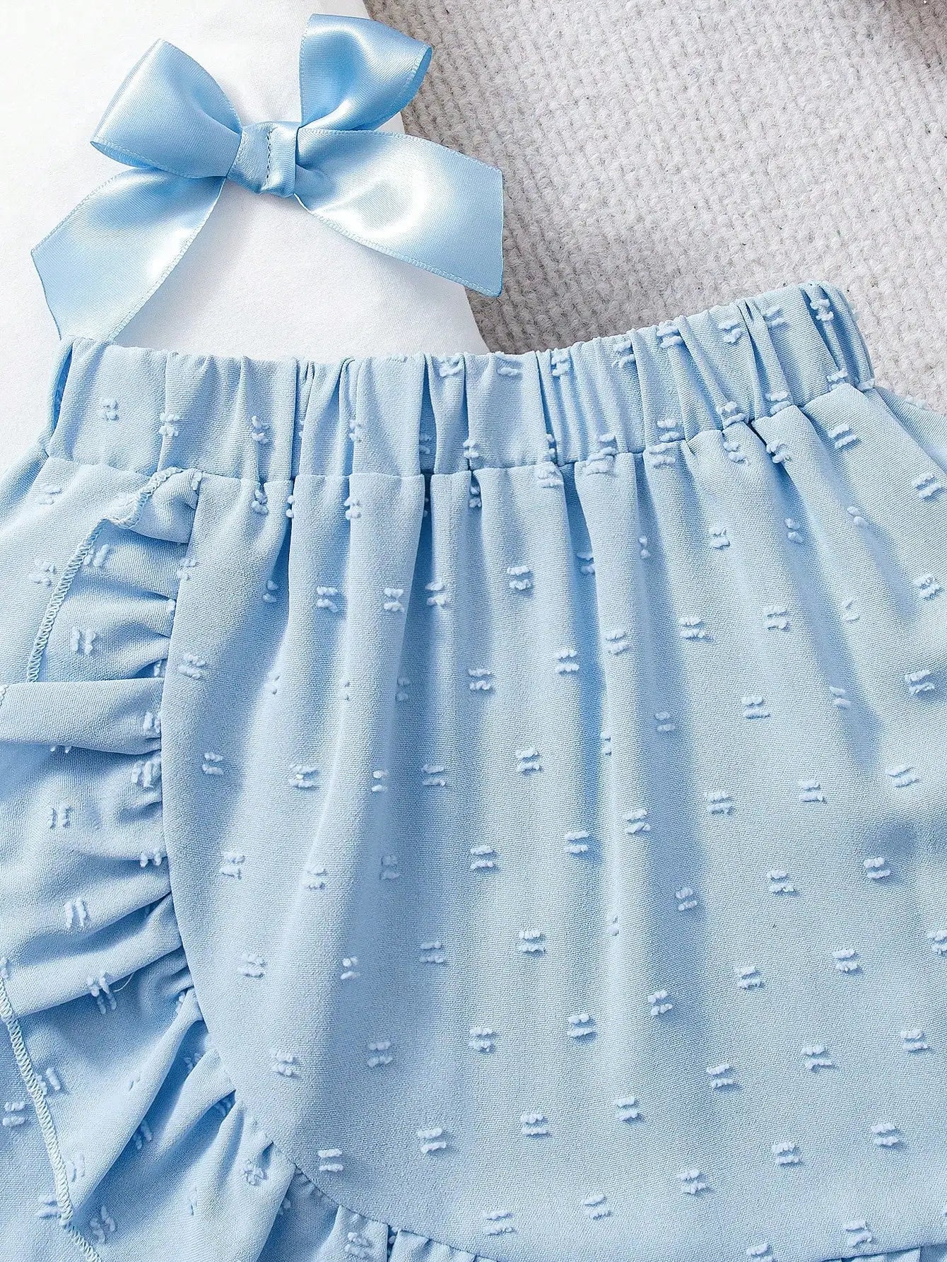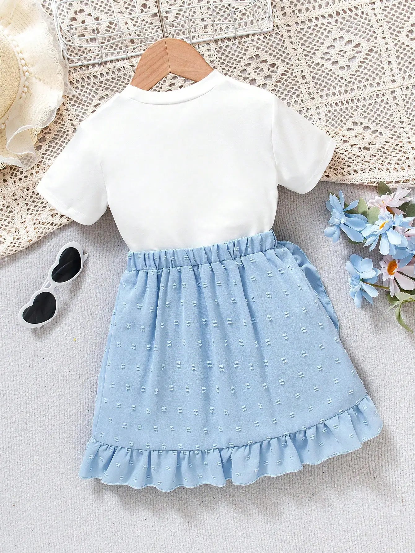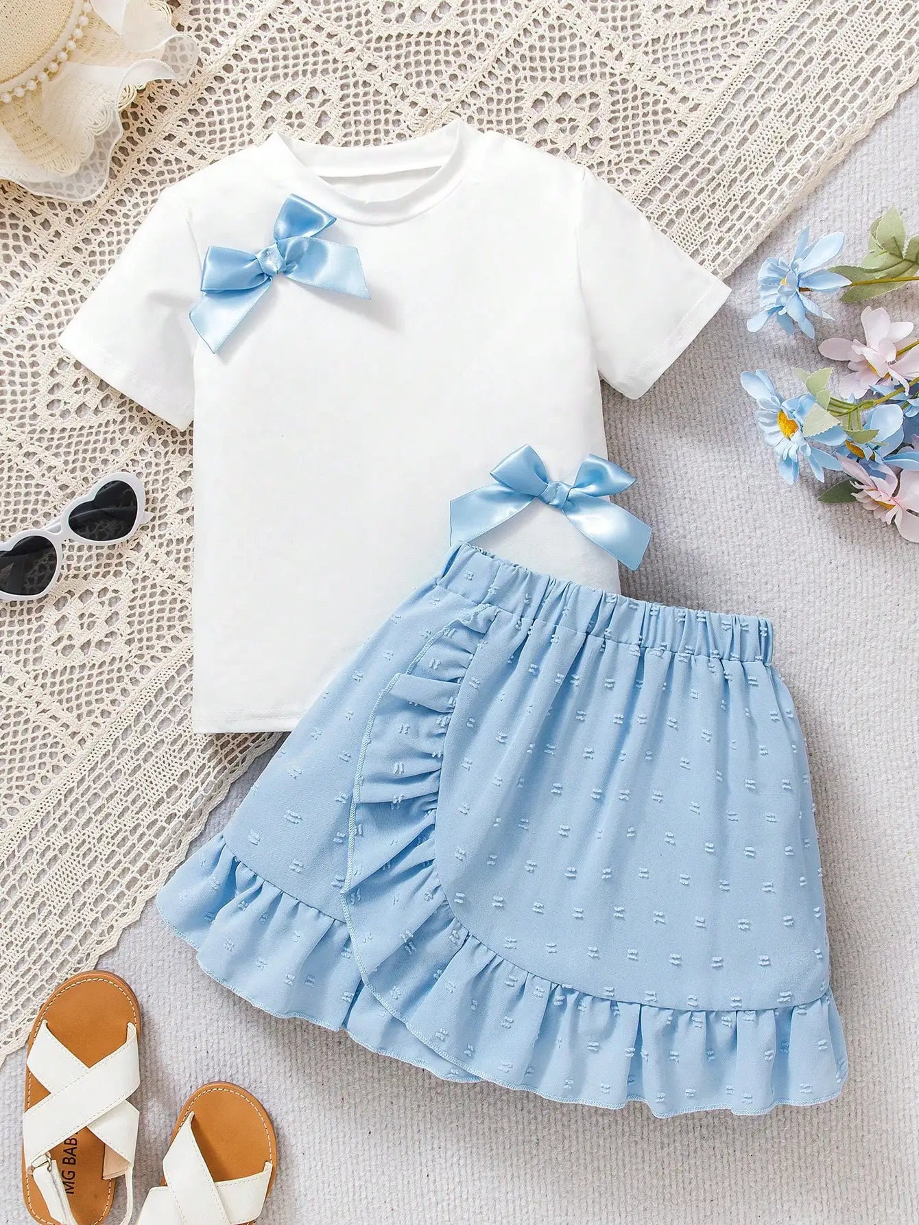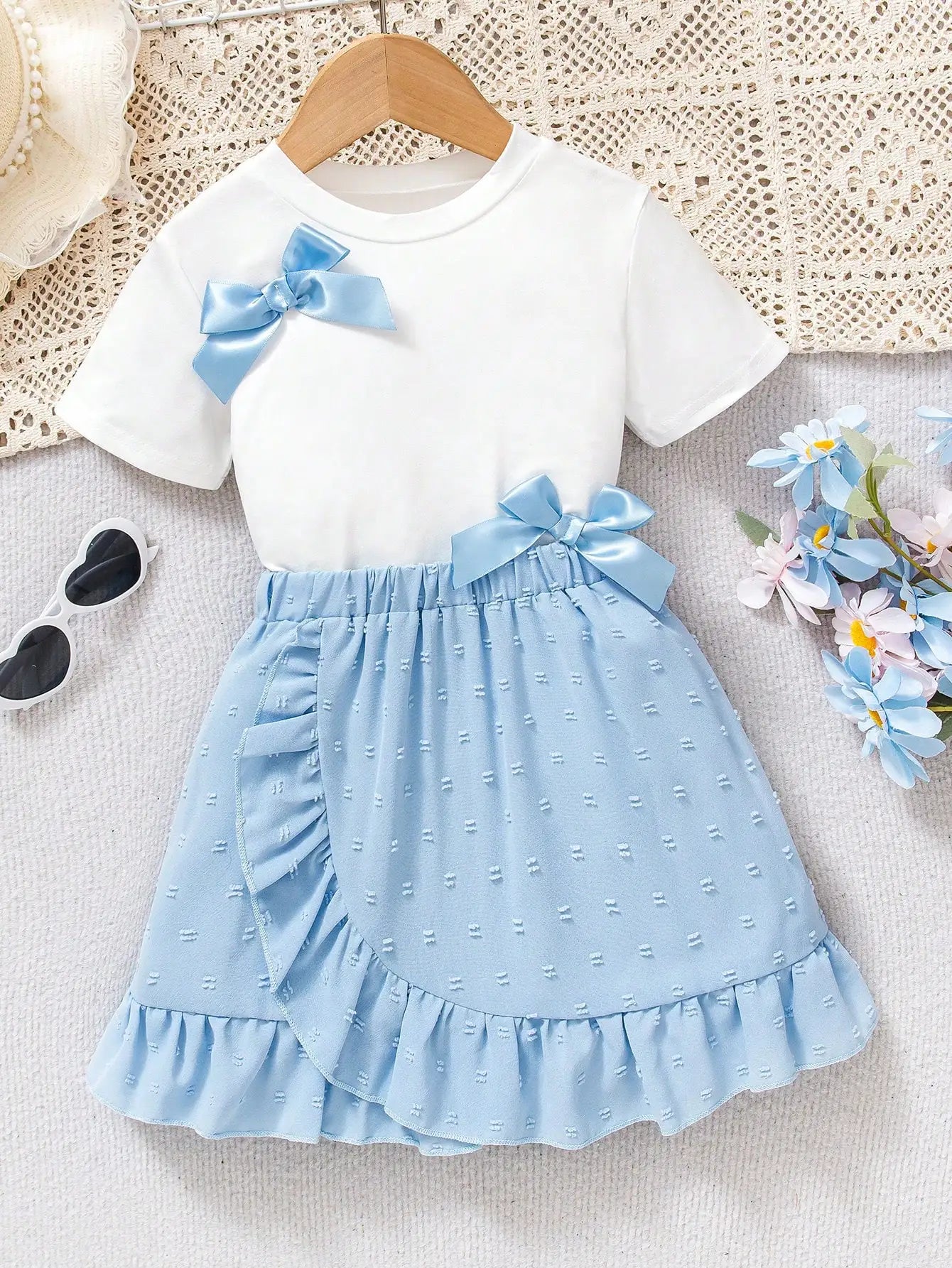 愛らしいリボンと清楚な配色が魅力的なセットアップです。真っ白なTシャツと水色のティアードスカートの組み合わせは、清潔感があり、お出かけにぴったり。