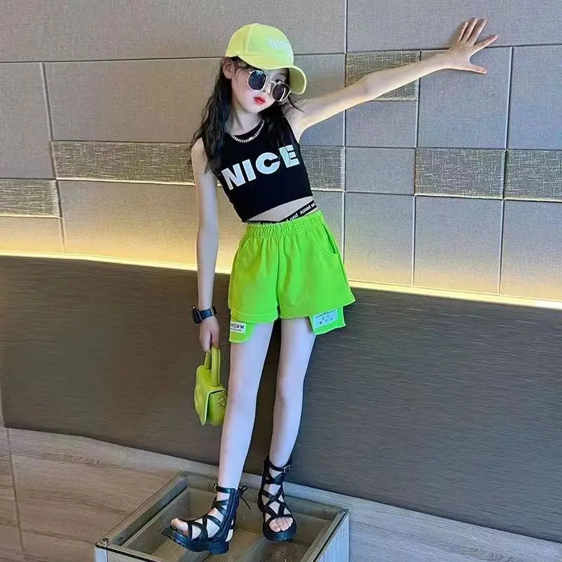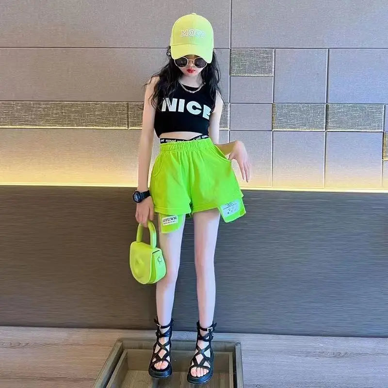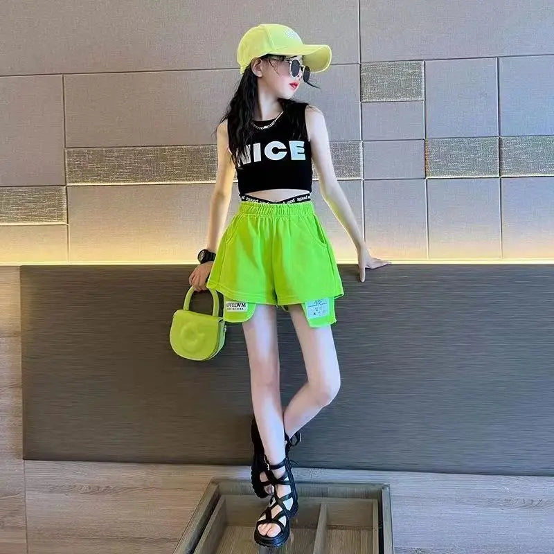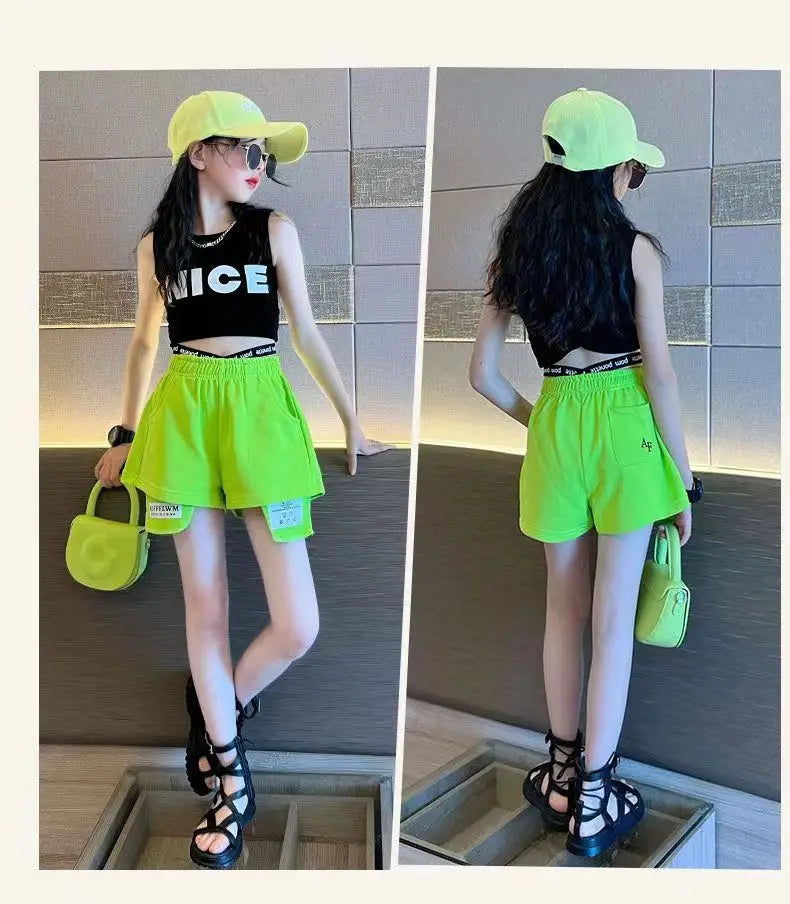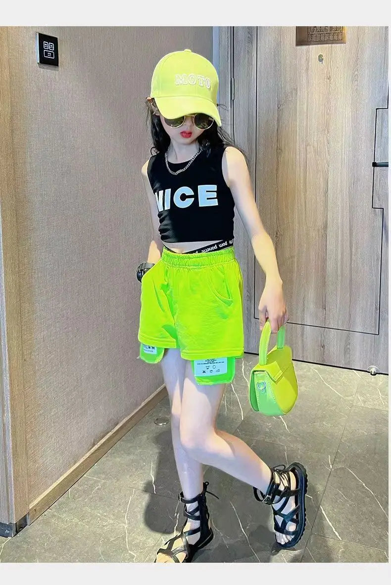 トレンド感たっぷりのストリートスタイルのセットアップです。鮮やかなネオンイエローのショートパンツと、クールなブラックのノースリーブトップスの組み合わせが目を引きます。